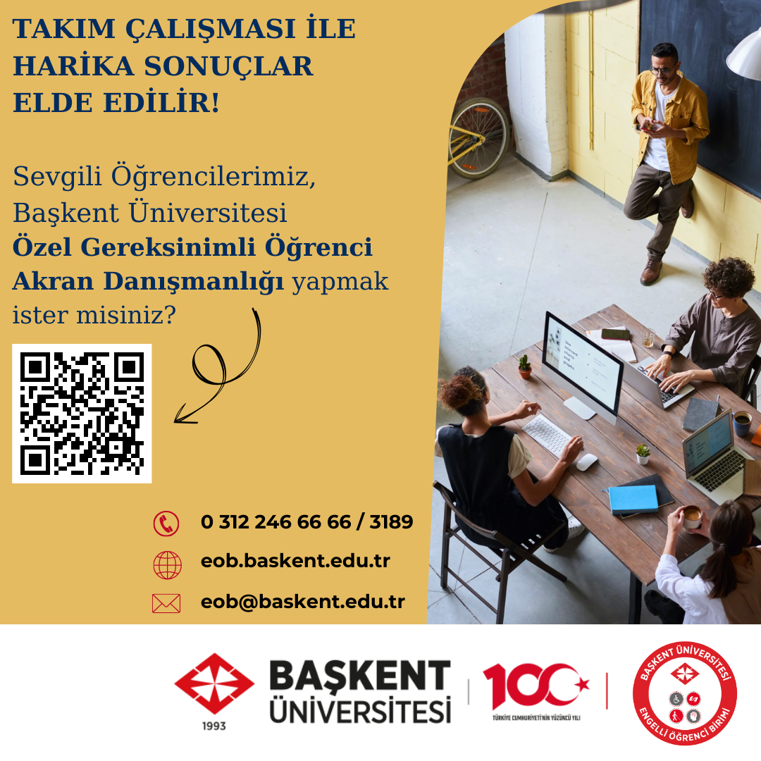 Fakültemiz akademisyen ve öğrencileri özel gereksinimli öğrencilerimize akran danışmanlığı yapabilmektedirler. Bu konu ile ilgili esaslar hakkında detaylı bilgi için bakınız: https://eob.baskent.edu.tr/kw/menu_icerik.php?birim=5084&menu_id=48