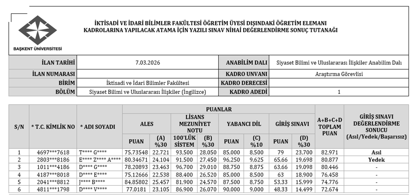 * Değerlendirme sonucu asıl kabul edilen adayın, 6 Nisan 2026 tarihine kadar tarafımızla iletişime geçmesini bekliyoruz. Nihai sonuç bildiriminde asil ve yedek olarak seçilen kişilerin evrakları Siyaset Bilimi ve Uluslararası İlişkiler Bölüm Başkanlığımız tarafından Personel Dairesi Başkanlığı’na iletilecektir. Personel Dairesi Başkanlığı, atama işlemlerine başlamak için asil adayla iletişime geçerek gerekli atama evraklarının temin edilmesi hususunda bilgilendirme yapacaktır.